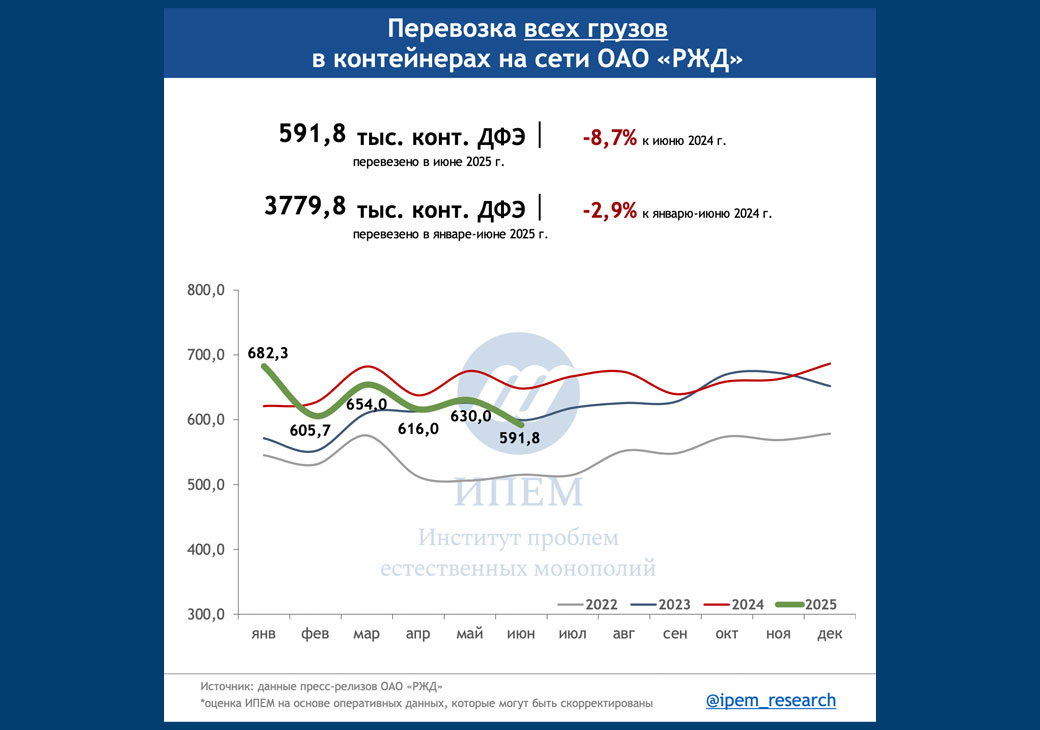 Количество гружёных контейнеров, отправленных во всех видах сообщения, составило 2,7 млн ДФЭ (-5,1%), что эквивалентно 40,1 млн тонн грузов (-1,3%). В июне контейнерные перевозки составили 591,8 тыс. гружёных и порожних контейнеров ДФЭ (TEU), что на 8,7% меньше июня 2024 года.