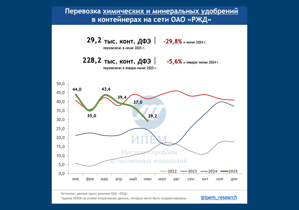 Снижение перевозки удобрений (-5,6%) на фоне роста перевозок в грузовых вагонах (+4,8%) происходит в связи с сокращением использования контейнерных перевозок у российских экспортёров через контейнерные портовые терминалы, а также сокращением перевозок белорусских удобрений транзитом в Китай через погранпереходы.