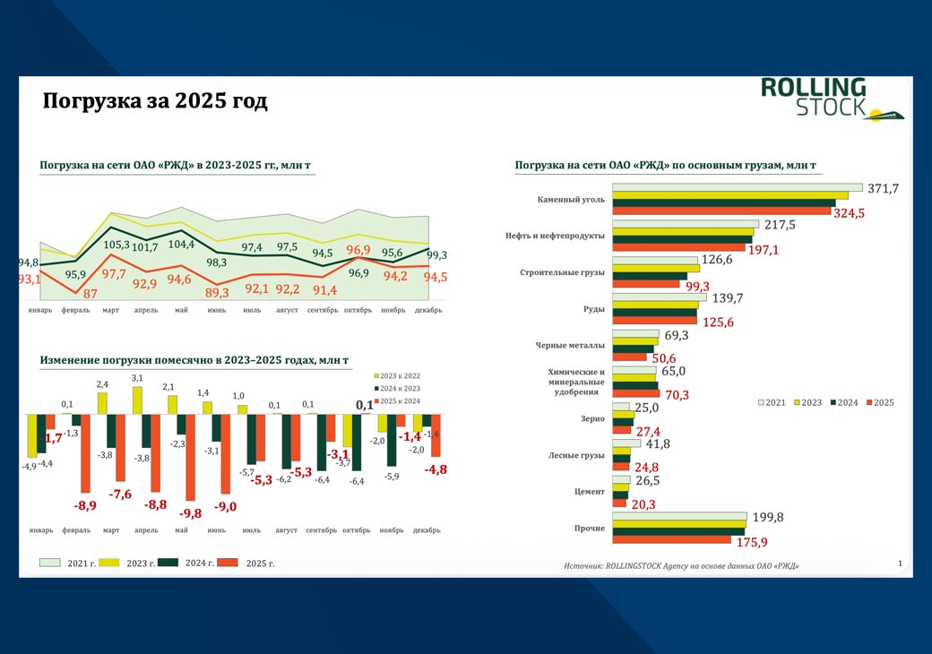 В декабре 2025 года по отношению к декабрю 2024 года наблюдалось усиление негативной динамики погрузки на сети ОАО «РЖД», что обосновано достаточно высоким уровнем грузовой базы декабря 2024 года. Так в декабре 2025 года к декабрю 2024 года погрузка сократилась на 4,8%. При этом в ноябре 2025 года к ноябрю 2024 года снижение было на уровне 1,5%, а в октябре 2025 года погрузка впервые за 24 месяца показала положительный результат увеличившись на 0,1%.