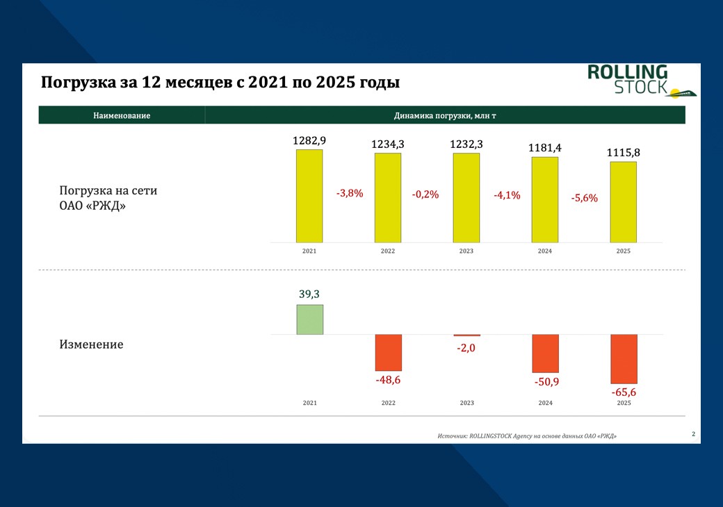 По итогам 2025 года погрузка на сети ОАО «РЖД» составила 1115,8 млн тонн. Стоит отметить, что на протяжении последних лет темпы сокращения погрузки нарастали. Если в 2023 году к уровню 2022 года погрузка сократилась на 0,2%, в 2024 году к уровню 2023 года снижение возросло до 4,1%, то в 2025 году к уровню 2024 года погрузка сократилась на 5,6%. Относительно 2021 года снижение составило 13,0%.