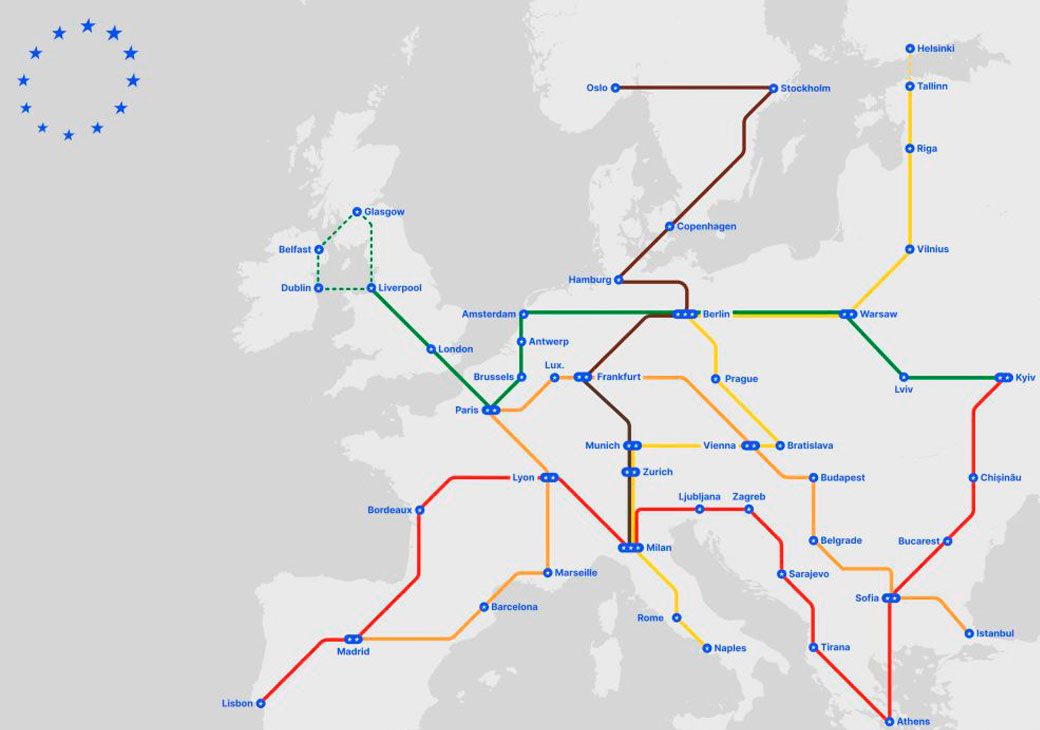 Схема, предложенная 21st Europe, визуально действительно впечатляет: густая, как метрокарта, сеть с узлами в Париже, Франкфурте, Милане, Барселоне и Варшаве. Между городами — прямые линии, обозначающие будущие высокоскоростные маршруты. Всё это должно быть встроено в существующую инфраструктуру — и, по замыслу авторов, дополнять уже реализуемые проекты ЕС в сфере железнодорожного сообщения. Но от чертежей к реальности — путь долгий и совсем не прямой.