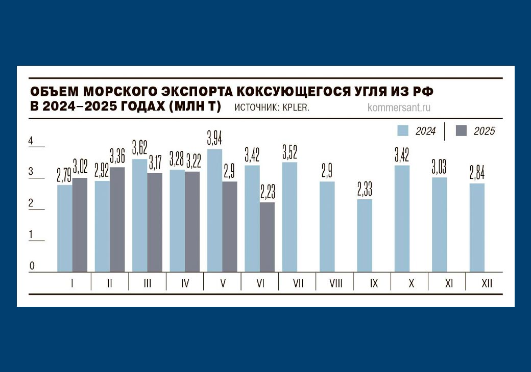 Вторым неприятным моментом для отрасли стало ощутимое падение морского экспорта коксующегося угля из России. Ещё недавно казалось, что проблемы энергетического угля не коснутся углей коксующихся. Они по определению дороже, да и спрос на них в последние годы подогревался промышленниками Китая и Индии. Но по итогам июня Россия экспортировала из портов 2,23 млн тонн этой номенклатуры груза — это на 23% меньше, чем в мае, и на 35%, чем в июне прошлого года. Показатель стал минимальным с сентября прошлого года, когда было отгружено 2,33 млн тонн.
