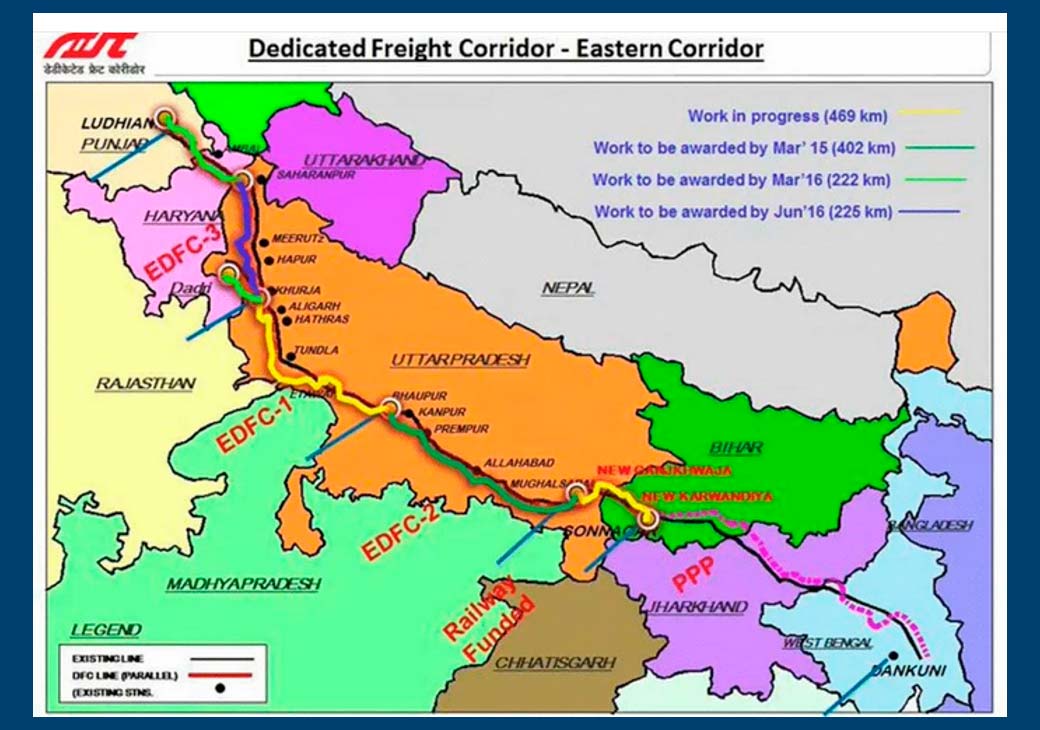 На карте видны этапы строительства первой фазы Восточного выделенного грузового коридора (EDFC) общей протяжённостью 1337 км от Лудхияны (штат Пенджаб) до Соннагара (штат Бихар). Оставшийся 519-километровый участок от Соннагара до Данкуни (штат Западная Бенгалия) планируется построить с использованием модели государственно-частного партнёрства.