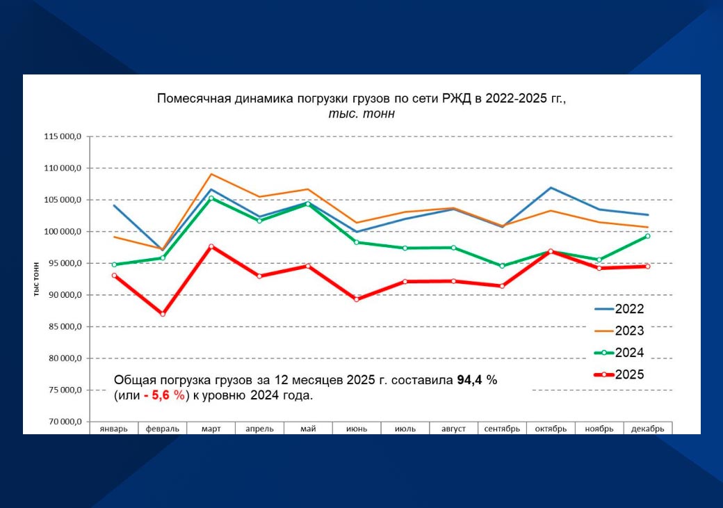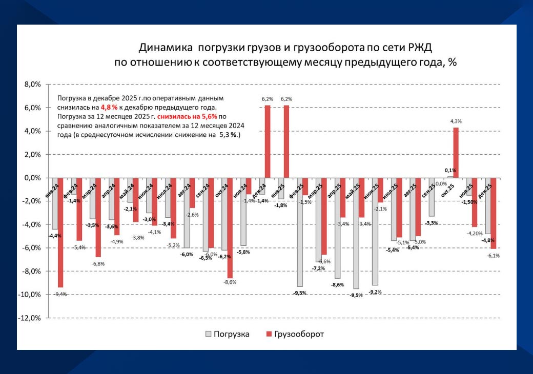 Президент Национального исследовательского центра перевозок и инфраструктуры Павел Иванкин в беседе в VG напомнил, что в первоначальных планах РЖД предыдущий год должен был быть закончен с +5% к погрузке 2024-го. Таким образом падение на 5,6% за 12 месяцев вряд ли можно назвать выполнением плана. Теперь нужно разбираться, где причины.