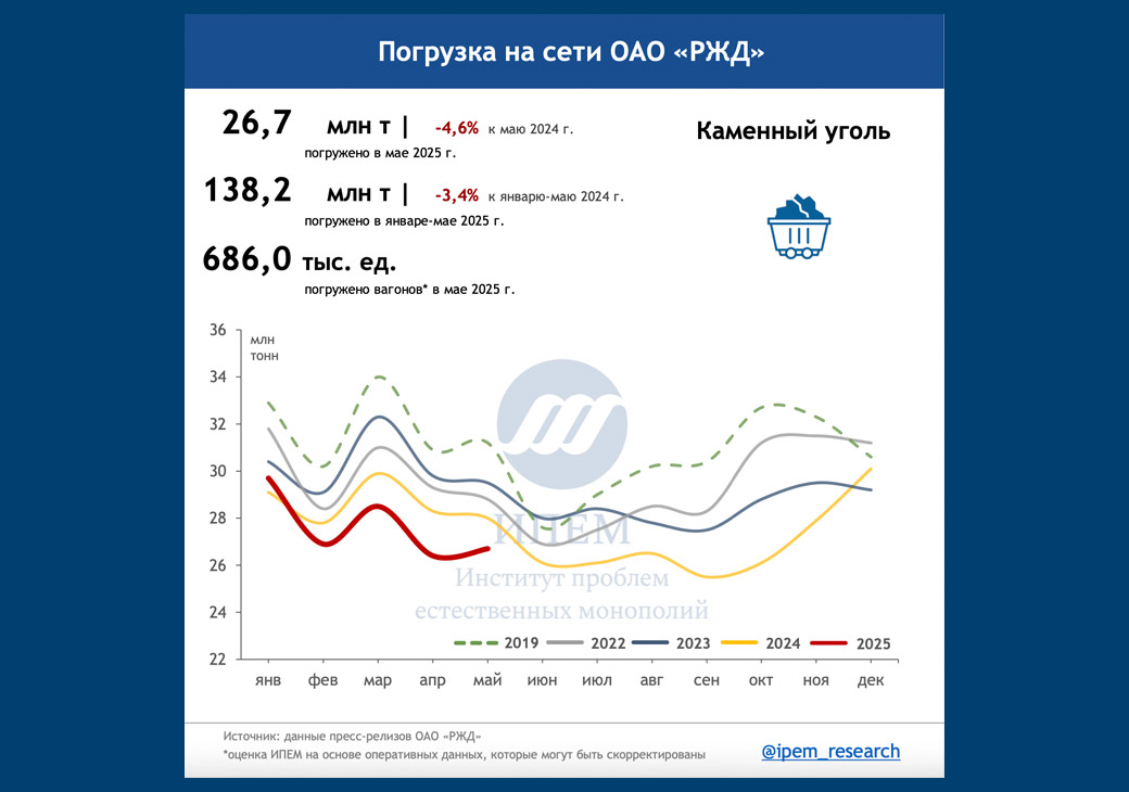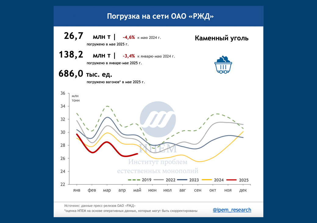 Последние 20 месяцев погрузка стабильно сокращается. Месячные колебания от 1,4 до 9,4% (максимальные в мае 2025). За первые 5 месяцев 2025 года железнодорожный транспорт потерял 36,8 млн т (-7,3%) по сравнению с аналогичным периодом 2024 года. За 5 мес. 2025/2023 составили -52,1 млн т (-10,1%), 5 мес. 2025/2022 — -49,6 млн т (-9,6%), 5 мес. 2025/2019 — -66,8 млн т (-12,6%).