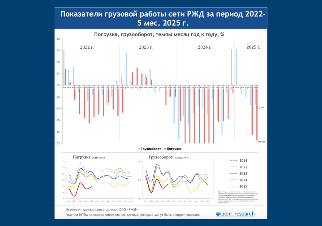 По данным Института проблем естественных монополий (ИПЕМ) наибольшие потери погрузки за 5 месяцев 2025 года составили: стройматериалы -9,8 млн т (-20,7% погрузки), нефть и нефтепродукты — -5 млн т (-5,7%), уголь — -4,9 млн т) (-3,4%), зерно — -4,8 млн т (-35%), чёрных металлов — -4,3 млн т (-16%), прочие грузы, значительная часть которых перевозится в контейнерах — -3,1 млн т) (-6,3%), промышленное сырьё — -2,6 млн т (-19%). В положительной зоне находятся удобрения +1,6 млн т (+5,6%), цветная руда +0,2 млн т (+3,1%).