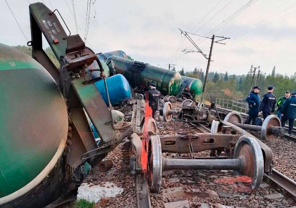 26 сентября горело на Московской ж/д. Фура выехала на переезд, сход локомотива и 18 вагонов, часть из которых — с бензином. По некоторым сведениям, погибший водитель выехал на переезд специально, но вскоре появилась другая формулировка —«решил выехать», а «другие версии произошедшего не рассматриваются».