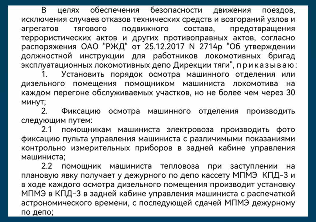 Приказ по депо в своей преамбуле ссылается на распоряжение ОАО «РЖД» от 25.12.2017 г. №2714р «Об утверждении должностной инструкции для работников локомотивных бригад эксплуатационных локомотивных депо Дирекции тяги». Оговоримся: в том, что по машинному отделению ходить надо, никто не сомневается.