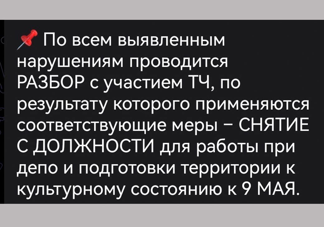 «По всем выявленным нарушениям проводится РАЗБОР с участием ТЧ, по результату которого применяются соответствующие меры — СНЯТИЕ С ДОЛЖНОСТИ для работы при депо и подготовки территории к культурному состоянию к 9 МАЯ».