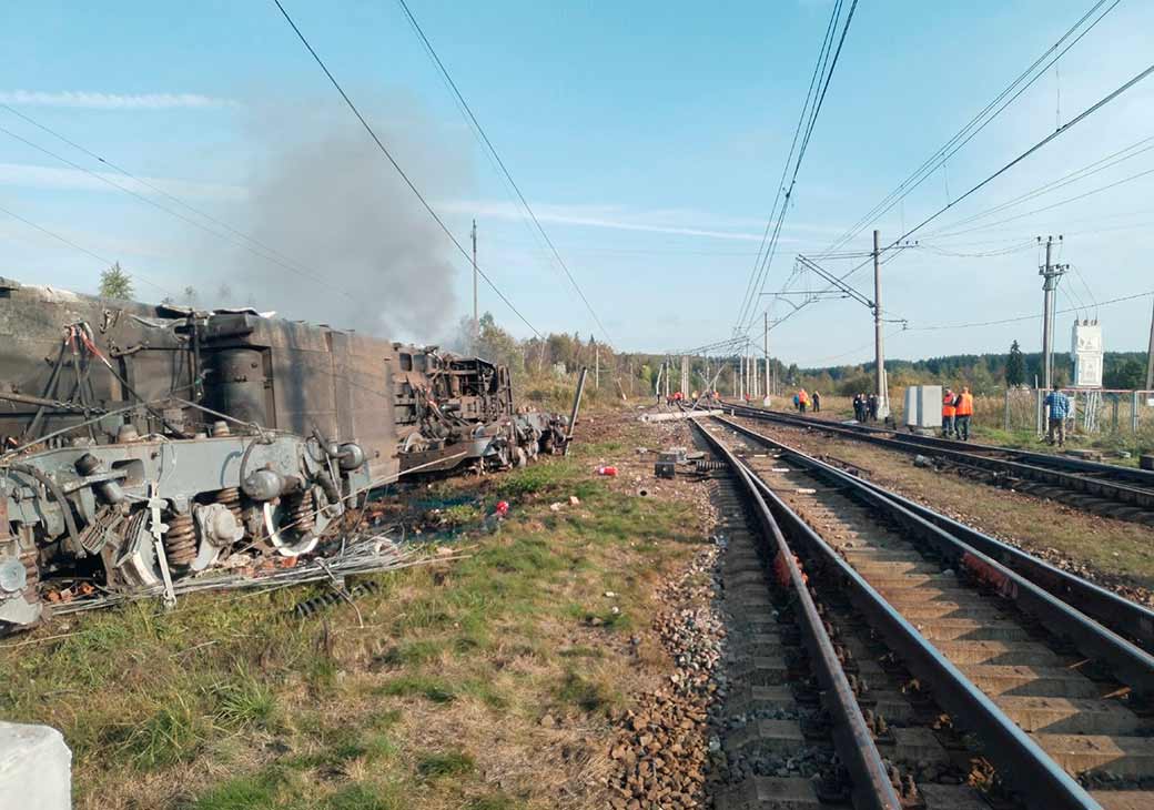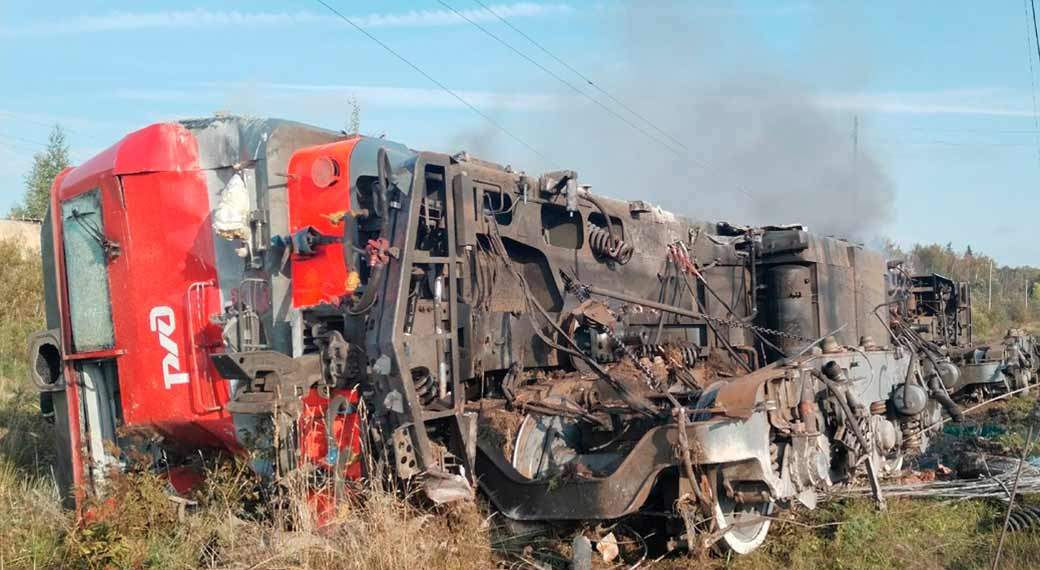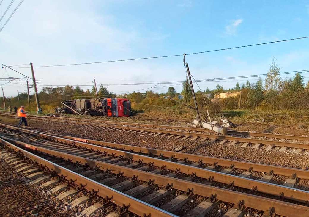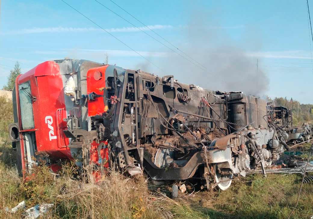 «однако при скорости 153 км/час на 44 км 8 пк 1 главного пути станции Семрино в 8 часов 08 минут произошёл сход локомотива ТЭП70БС№ 362 всеми колёсными парами с железнодорожного пути последующим опрокидыванием набок».
