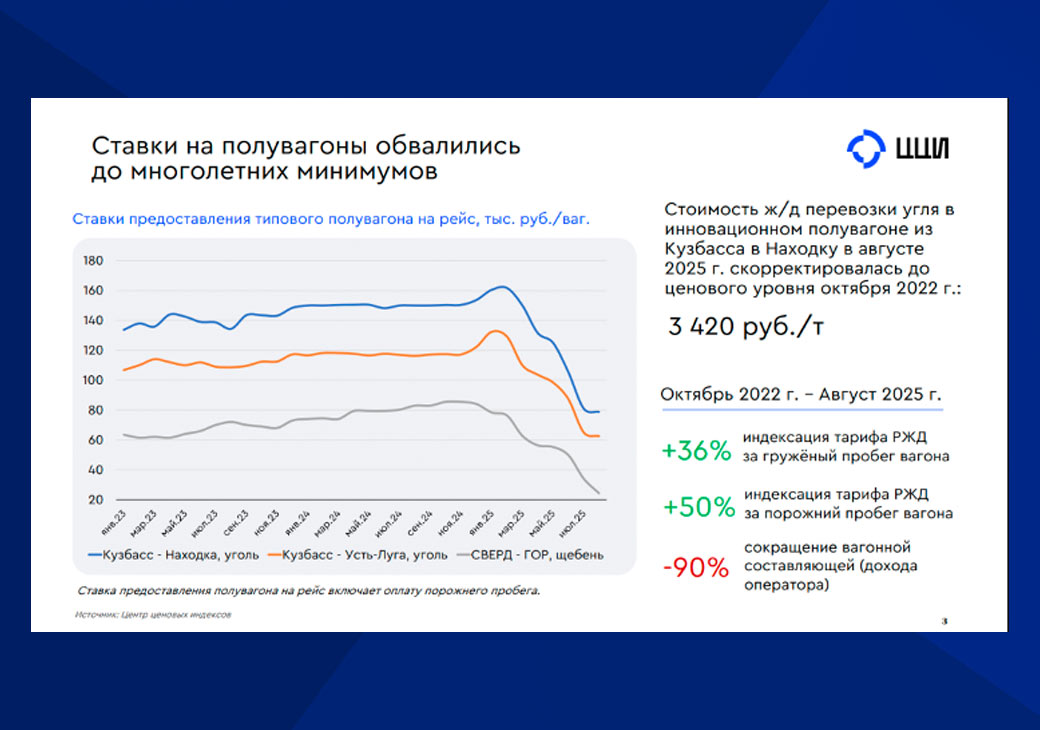 На конференции «Операторский бизнес: экономика, качество, технологии», организованной в середине сентября информагентством «РЖД-Партнёр», аналитик Центра ценовых индексов (ЦЦИ) Роман Шагалов разбирал экономику операторов подвижного состава. В сентябре 2025 года спотовая ставка на перевозку угля в типовом полувагоне из Кузбасса в порт Дальнего Востока составила 80 тысяч рублей. Эта сумма соответствует расходам операторов на оплату порожнего пробега при возврате под следующую погрузку. Таким образом доходность оперирования типовым полувагоном на таком маршруте равна нулю. В итоге на рынке возникла ситуация, когда операторам выгоднее выполнять перевозки с нулевой доходностью, чем быть отправленным в отстой, не зарабатывать на этом ничего и за этот отстой ещё платить.